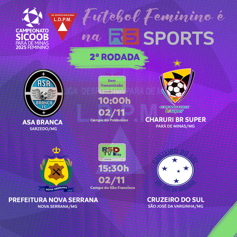 A 2ª rodada do Campeonato Sicoob Feminino de Pará de Minas, promovido pela Liga Desportiva de Pará de Minas (LDPM), ocorrerá neste final de semana com dois jogos. No período da manhã, o Asa Branca de Sarzedo fará sua estreia na competição contra o Charuri BR Super de Pará de Minas.À tarde, será a vez da Prefeitura de Nova Serrana enfrentar o Cruzeiro do Sul de São José da Varginha. Você poderá acompanhar a partida entre a Prefeitura de Nova Serrana e o Cruzeiro do Sul aqui na RS SPORTS.Anteriormente, foi divulgado que o jogo entre Asa Branca e Charuri seria transmitido, mas devido à falta de cabine de transmissão no campo escolhido, essa partida não será exibida pelo canal.