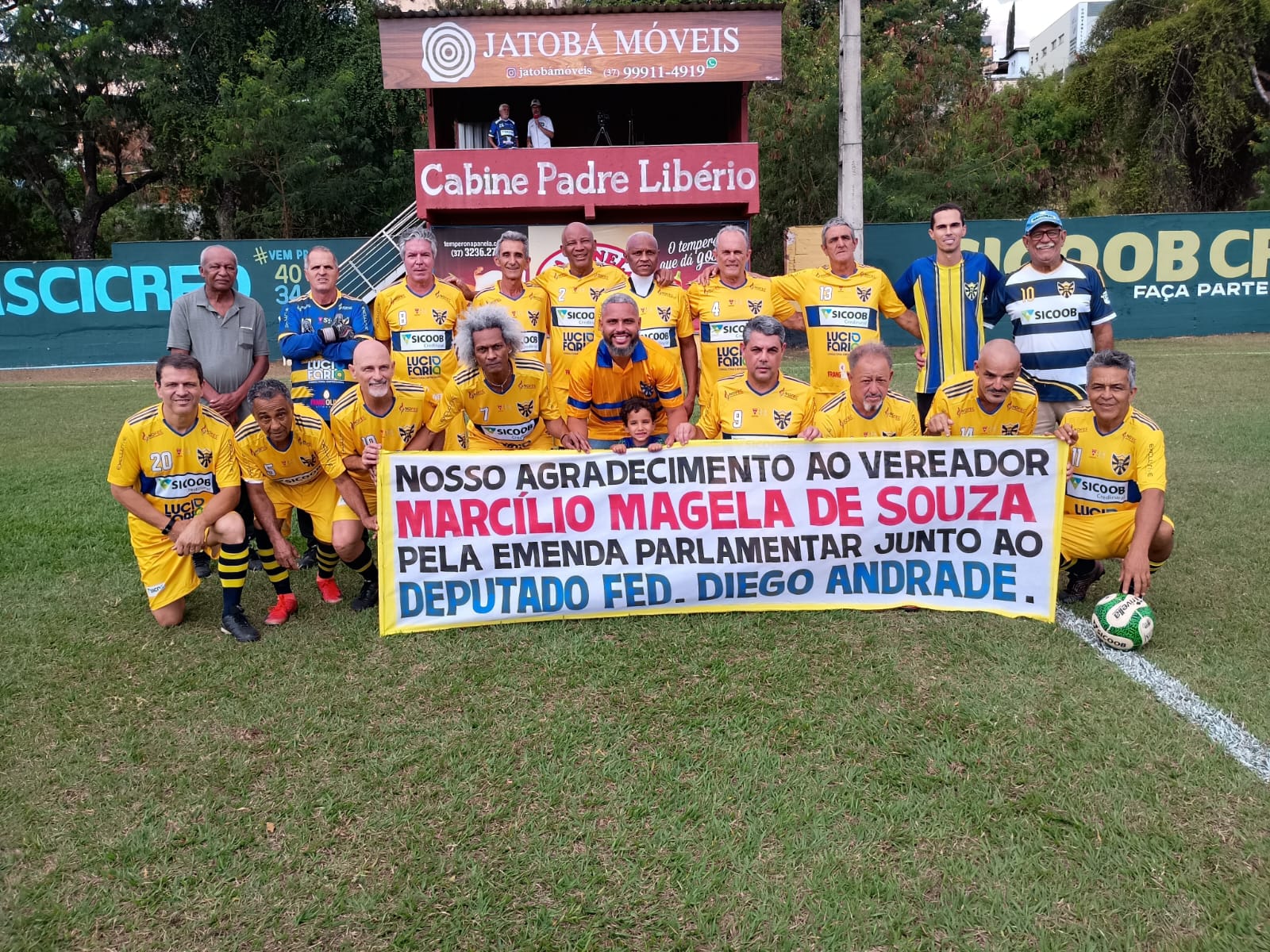 Ex narrador Jesus Geraldo de Oliveira da Radio Santa Cruz de Pará de Minas é homenageado no amistoso de veteranos, entre Guarani e Rio Branco, no 166º aniversário de Pará de Minas.